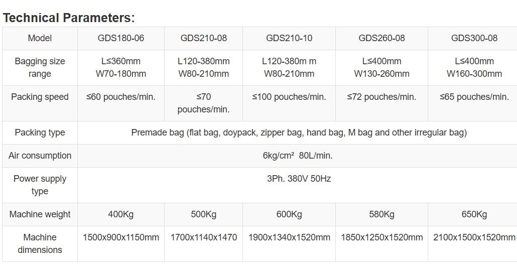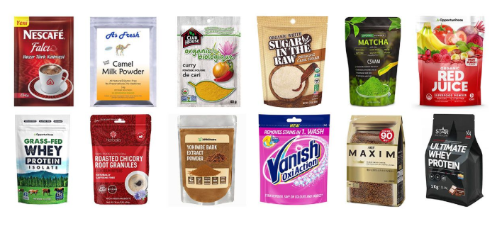 soontrue automatic powder pre-made bag packing machine suitable for automatic packing for dry powder, such as milk powder, glucose, monosodium glutamate, seasoning, washing powder, chemical materials, fine white sugar, pesticide, fertilizer, etc. Different kinds of product with stand up pouches, doypack with zipper, 3 side seal bags, 4 side seal bags, flat bags, pouch with hole, spout pouch, etc